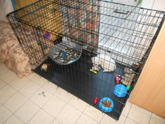 Hij kan er alleen zomaar 'ingestopt'worden(lokken met iets leuks of lekkers,zodat hij er vanzelf in loopt en alle eetmomenten in de bench doen,zodat hij het als een veilig en leuk holletje gaatbeschouwen)als hij er mee vertrouwd is.