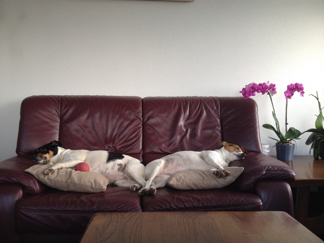 Synchroon slapen hihi. Fanny moest en zal die rode bal bij haar hebben, maar viel al snel in slaap. Ze liggen nog steeds allebei zo op de bank