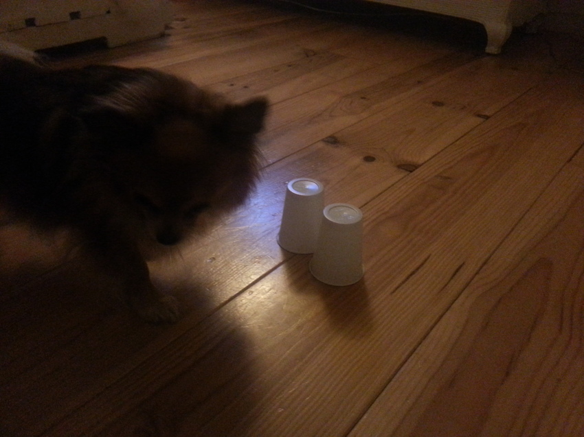 Dit is bij de hondencursus, hier leg ik zo meteen een koekje op een schaaltje wat in het water drijft en dat moet Black op zoeken.
