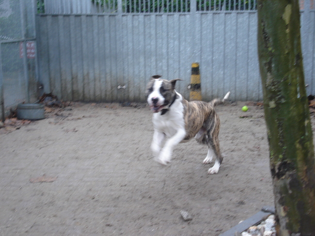 Zijn voorgeschiedenis: er stond een afspraak gepland bij het asiel met een mevrouw die met haar hond zou komen, ter kennismaking. het asiel twijfelde namelijk al of ze zo'n soort hond wel wilden aannemen, omdat ze moeilijk te plaatsen zijn. Dus zou ze eerst met hem langskomen zodat het asiel kon inschatten hoe de hond zou zijn. Bij deze vrouw zat hij altijd in de tuin en volgens het asiel kon ze hem niet meer aan/teveel werken iets in die trant. Echter, ze belde de afspraak af omdat ze een thuis gevonden had voor hem. En een paar dagen later....Django bij ons in de opvang als zwerver. Haar gegevens had het asiel niet meer, zij twijfelen eigenlijk of zij "dader" is en hem de straat heeft opgezet, want ze geloofden haar echt toen ze zei dat ze een thuis had gevonden en waarom anders al die moeite van een afspraak maken enzo? Dan had ze hem net zo goed meteen de straat op kunnen schoppen toch? Een beetje vaag dus allemaal.