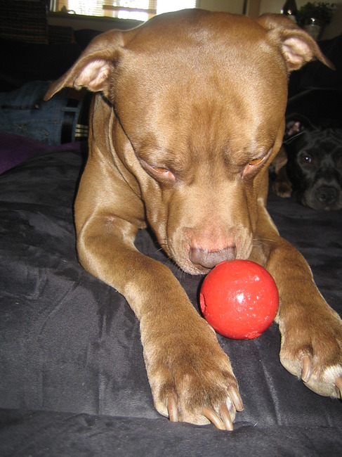 Diablo en zijn rode bal>onafscheidelijk en stokken is die ook helemaal gek op .