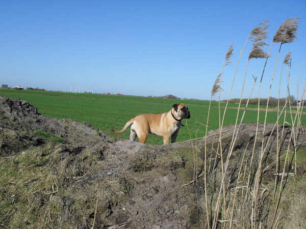 Dagelijks lopen Diesel en ik een rondje door het weiland, ze vindt dit heerlijk. Achter in het land staat een huis waar een grote zwarte hond woont die luid en duidelijk laat weten dat dit zijn erf is, en dat wij daar niets te zoeken hebben. In het begin schrok Diesel zo van die hond dat zij snel naar huis rende. Naarmate wij vaker langs het huis liepen ontdekte Diesel dat zij veilig was achter een sloot en afrastering. Ze durft zelfs heel stoer naar de grote zwarte hond te blaffen. Ikzelf, net zo stoer als Diesel, vond het ook wel een veilige gedachte dat de hond achter de sloot bleef. Op een dag tijdens onze wandeling lopen wij weer in de buurt van het huis. Geen geblaf deze keer. Er zijn een aantal bulten modder waar het altijd leuk spelen is voor Diesel. Plots zie ik een zwarte schim, help, de grote zwarte hond is uitgebroken! Diesel, vast in de veronderstelling dat haar niets kan gebeuren ziet het ook en zij gaat er als een speer op af. Zij ontdekt al snel dat er haar wel wat kan gebeuren en komt met dezelfde vaart weer terug met de grote zwarte hond achter haar aan. Ze gaat achter mij staan, en daar sta je dan met een grote schuimbekkende hond met al zijn haren overeind voor je, en een niet meer zo stoere Diesel achter je. Nadenken, wegrennen?, geen optie, de hond kan veel sneller. Laten schrikken?, (iemand heeft mij wel eens verteld dat dit kan) durf ik niet, straks valt de hond mij aan. Wat nu? De grote zwarte hond blijft voor mij staan. Ik besluit maar eens heel stoer naar hem te grommen en langzaam weg te lopen. Diesel blijft, zoals zij op de les heeft geleerd, aan mijn voet lopen en yes!!!!!, de grote zwarte hond gaat weer naar zijn huis. Diesel bleef de verdere wandeling keurig aan de voet lopen, en mijn hartslag was, toen wij weer thuis waren, weer een beetje normaal. Nooit geweten dat een hond uitlaten zo spannend kan zijn!