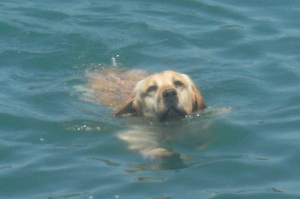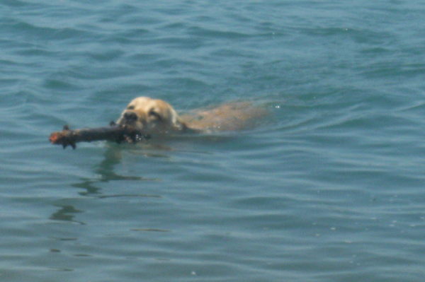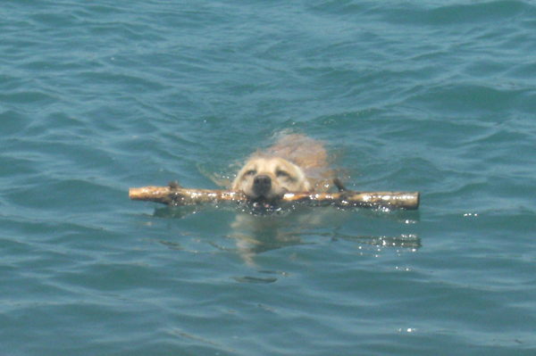 Ik ging terug naar het baasje, want die was ondertussen aan het roepen dat er nog stokken opgeruimd moesten worden en ik die taak niet zomaar kon laten liggen voor een witte mensenbal. Dus ik braaf terug en naar de stok die ze al voor de honderdste keer in het water gooide er uit te halen. Maar ik keek om en nu was het mensenhoofd verdwenen en was er alleen nog die witte bal, mijn interesse was weer aangetrokken en ik vergat de vervuiling en ging er achter aan. Weer kreeg ik met een om draaiende bal te maken en nu was ik het beu, ik ging naar de kant en dat was ondertussen nog een stukje zwemmen. Ik mag wel zeggen dat ik moe was na dit rare avontuur.