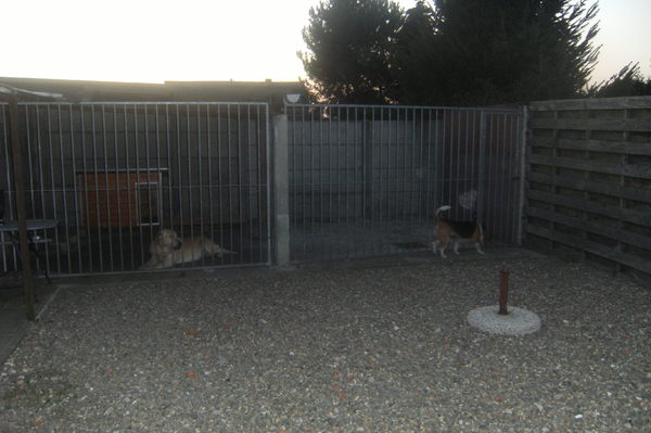 het zit namelijk zo!! Mijn broers slapen buiten vanaf dat ze drie maanden zijn, eerst overdag en bij een broer en daarna alleen. Ik weet niet goed wat ik hiervan moet denken. Kijk ik heb een hekel aan opgesloten worden, maar het is veel groter dan mijn bench. Ik mag er mijn behoeften doen en ik kan spelen met mijn grote broer Yenzo.