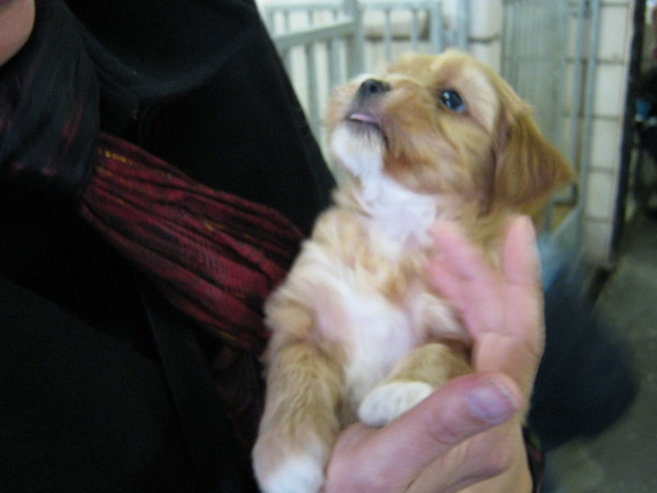 Gistermiddag was het zover. Rond 13 uur waren Math en ik in St. Oedenrode en mochten we eindelijk na twee lange weken wachten onze "Saar" ophalen. Ze was alweer behoorlijk gegroeid...(vooral de haartjes). We kregen een hondenpaspoort mee...nog een wormkuurtje,hondenbrokjes en boekjes met tips. (die waren eigenlijk niet nodig want ik heb inmiddels wel 5 of 6 boekjes met honden opvoedtips in huis )De terugreis met Saar had ik me dan ook heftig voorgesteld. Honden kunnen wagenziek worden, ze kunnen plassen,poepen of gaan piepen. Maar Saar lag heel rustig een half uur lang. Daarna werd ze wat onrustiger. We zijn gestopt bij een tankstation en hebben haar daar met een riempje om even laten lopen. Nou...ze wist niet wat aan haar was.. Alles was leuk...dat gras,die bladeren. Saar vond alles leuk,behalve dat halsbandje...