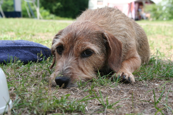 Vorig jaar hebben we het trimmen overgeslagen in verband met een operatie die ze in februari had gehad . we wilden dit haar niet aandoen . Een vriendin van ons heeft haar toen onder handen genomen met een schaar , en dat heeft haar een hoop stress bespaard . Ze vind het heerlijk dat haar dikke jas nu uit is .Laat de zon maar schijnen !Als de temperatuur van het water nu ook nog even omhoog gaat , kunnen we ook weer lekker zwemmen .We hebben er zin in !