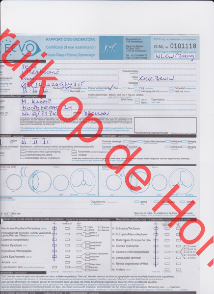 van bono, skye en sterre heb ik hd foto's laten nemen en laten beoordelen door de dierenarts omdat de raad van beheer het niet deed, heupen waren goed, van lot, marley, tess, beer en puk heb ik beoordelingen van de ofa dit is een amerikaanse beoordeling, vier dierenartsen beoordelen dan de heupen en daar krijg je de uitslag van , mijn honden hebben of de beoordeling GOOD gekregen ( staat gelijk aan A2) of excellent (A1) je kan de volgende uitslagen krijgen 1.excellent 2.good 3.fair (b) 4 borderline (b2) mild (c) moderate en severe (d) ook laat ik hun ogen jaarlijks testen door dr. gutteling en zijn ze vrij bevonden