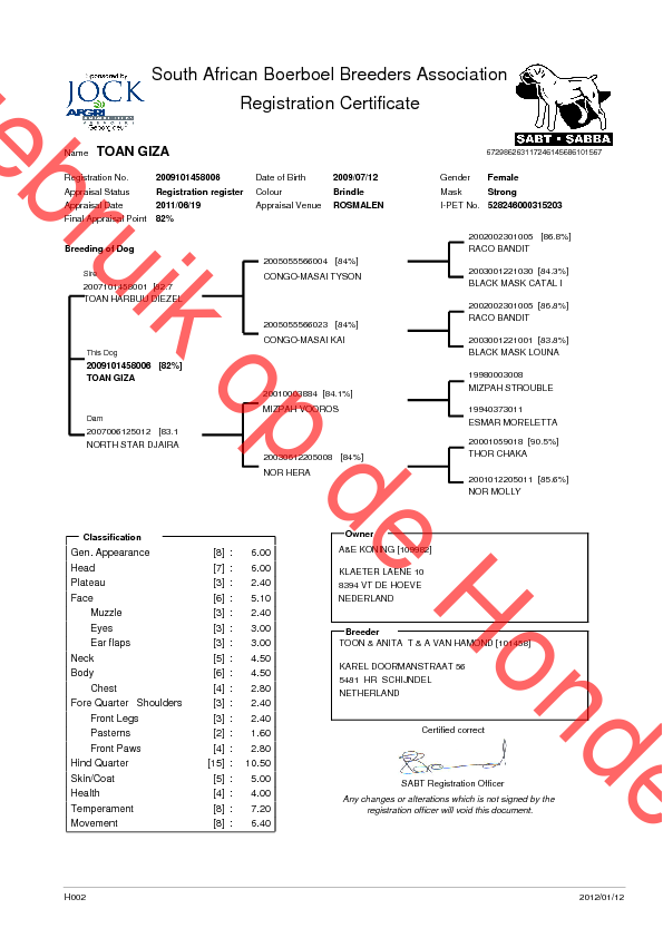 De ouders zijn klinisch en röntgenelogisch gekeurd. Beide zijn HD en ED vrij. Hebben geen entropion en ectropion. Giza heeft geen vaginale prolaps.