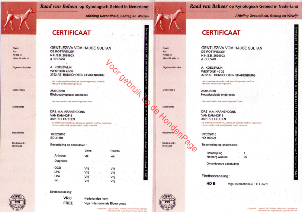 De ouders van Ziva zijn op HD en ED getest en voldoen aan de eisen uit het land waar ze vandaan komen. (Belgie en Duitsland) De ouders van Hera zijn beiden op HD en ED getest en hebben beiden de mag-test gedaan.