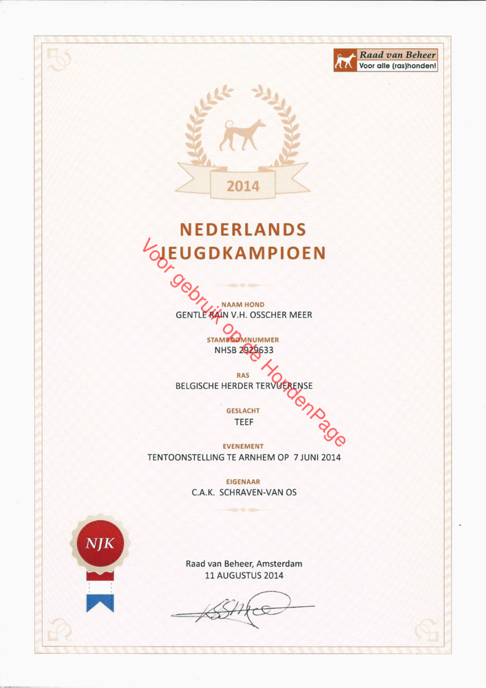 In 2012 is Gentle Nederlands Jeugd Kampioen geworden (exterieur). Gehoorzaamheid: E.G + V.E.G, agility recreanten.In juni 2013 is haar eerste nest geboren waaruit wij een teefje hebben aangehouden genaamd Halo ( Gentle Rain v.h. Osscher Meer) Halo is een heel mooi donkerrood teefje met een super fijn, werklustig karakter. Inmiddels is ook zij Ned. Kampioen en traint mee in de G&G B en behendigheid recreanten.