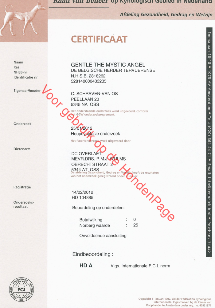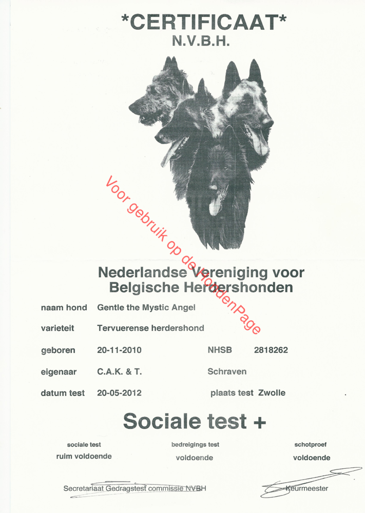 Gentle is getest op heupdysplasie, uitslag HD-A. Verder is zij geslaagd voor de verplichte gedragstest van de N.V.B.H met de kwalificatie; Sociaal plus. Dat houdt in dat ze is geslaagd voor het sociale gedeelte, schot en bedreiging. De reuen die wij gaan gebruiken moeten voldoen aan de gestelde gezondheid en exterieur eisen zoals gesteld door de NVBH en BHCN. Informatie hierover is te vinden op onze website. Ook haar dochter Halo heeft HD-A heupen en is geslaagdvoor de gedragstest van de NVBH. In 2016 heeft ze een ECVO test gehad (ogentest) en is vrij verklaard voor alle aandoeningen.