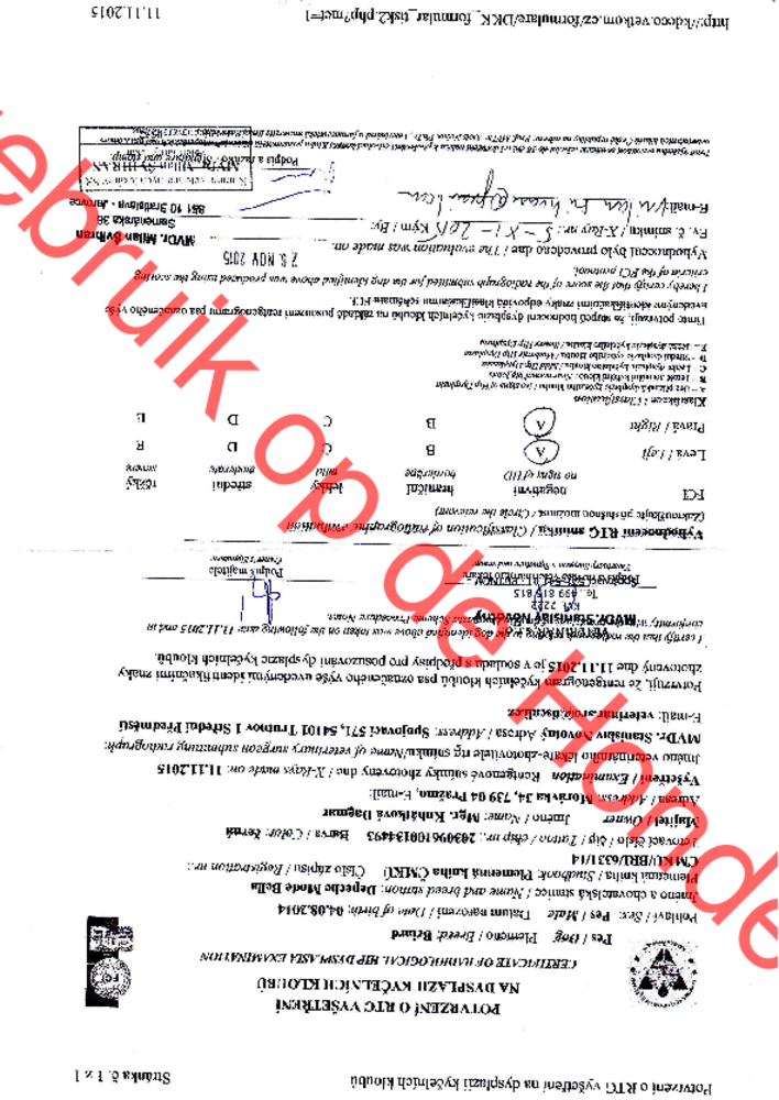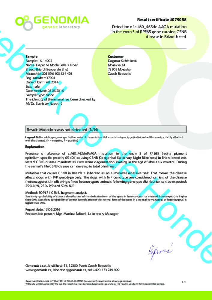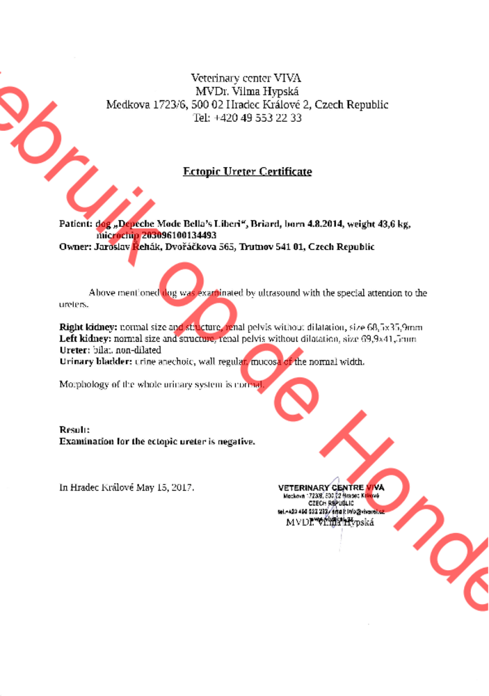Vader: schoonheidskampioen Depeche Mode Bella's Liberi, HD-a, CSNB-vrij, EU-vrij, ECVO, DNA. Dipp is Tsjechisch club kampioen schoonheid (hij woont in Tsjechië). Wij hebben Dipp uitgekozen als partner voor onze Tika omdat hij goed gezond is, de inteelt binnen het ras extreem laag is in deze combinatie en hij qua type heel goed bij haar past.