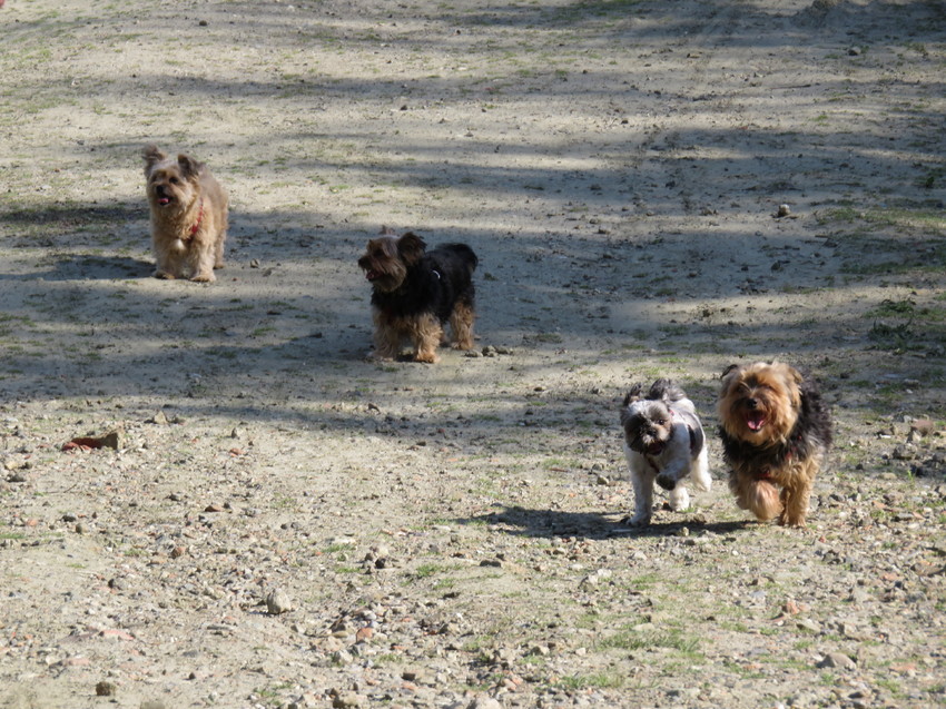 "Doen jullie maar allemaal maar gek en hevig ! Ik blijf rustig lopen aan de veilige zijkant !". Kijk hoe Babbe aarzelend in het midden blijft hangen... Haar mamske nooit uit het oog durven verliezen, maar toch willen meespelen met Diva en Toshi.