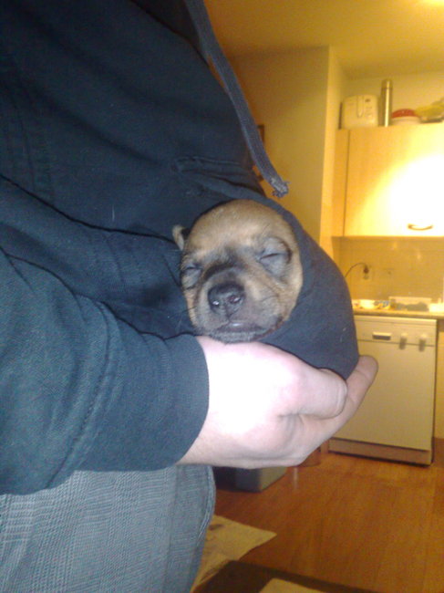 Honden foto's > Beau > Julendey houd er van om zo bij DJ in zijn trui te slapen... 15-01-2009