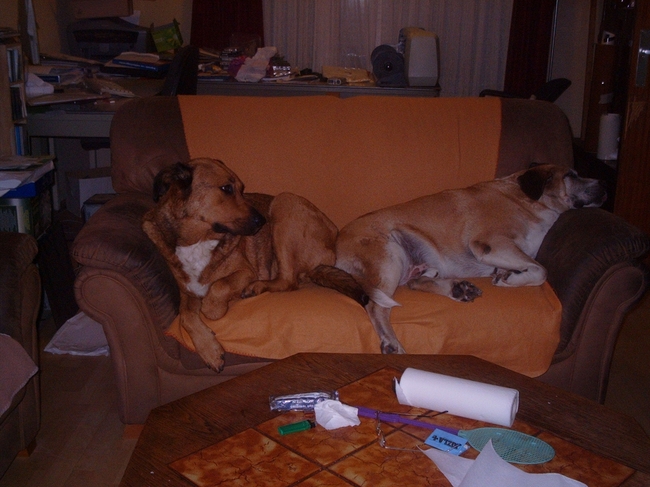 Honden foto's > Hondenhumor Sasja de Eerste ITC-Hond die nu met pensioen is. > 2 grote honden in een kleine bank gepropt