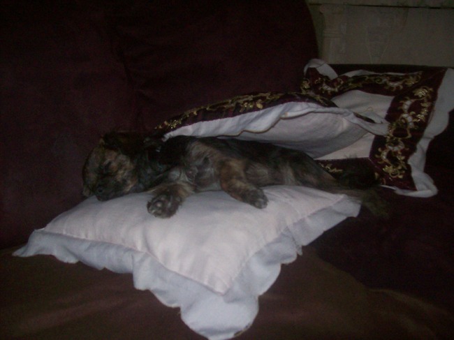 Honden foto's > Kimberley > Gipsy vind het heerlijk om met kussens op zich te slapen