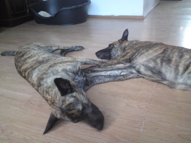 Honden foto's > saskia > dit ben ik met mij man hij heeft mij gedekt nu rusten wij uit