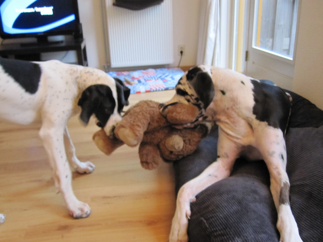 Honden foto's > Lotte met Hobbe > Ik wil die beer!