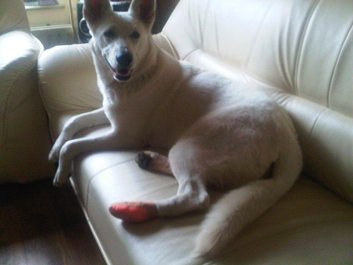 Indra dr pootje in verband, hechtingen in dr poot omdat ze een wond had door het spelen in het bos. van christien