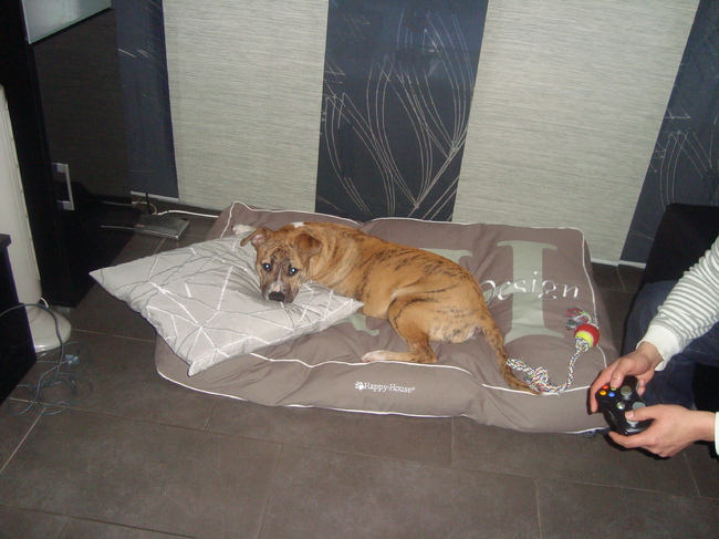 Honden foto's > kyle > op mijn nieuwe plaatsje. Fijn die kussen!!!