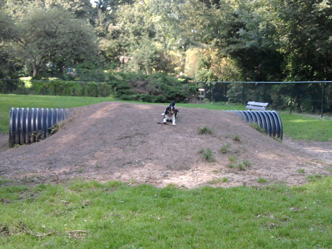 Honden foto's > Charlotte > Midden op een zandheuvel met een tak.