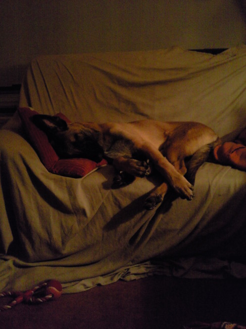 Honden foto's > sylvia en django > Django in diepe slaap op de bank