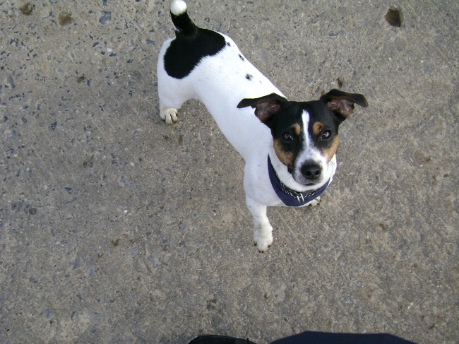 > Hier nog eens ons minitje :) vrolijk buiten aan het wachten tot we haar bal weer gaan gooien ze zou niets anders willen doen , de hele dag door moest het aan haar liggen :)