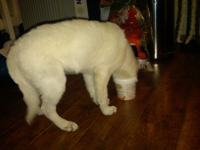 Honden foto's > Nadine, Deniz & Santi > Emmer leeg likken met heel d'r koppie er in haha