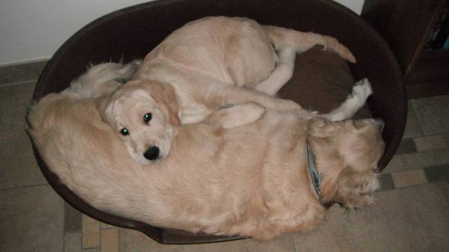 Honden foto's > Marleen K. > Tess bij Boomer (14,5 jaar) in zijn mand.