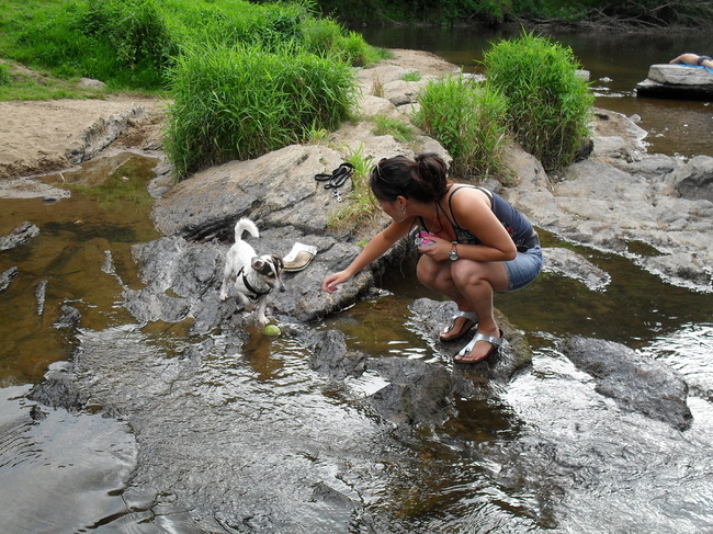 Honden foto's > Jin & Melo de tennisballenverzamelaar. > Samen met vrouwtje bij een riviertje.