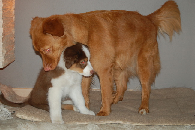 Honden foto's > Robbert, Maaike, Joey & Finn > Caya en Finn maken kennis