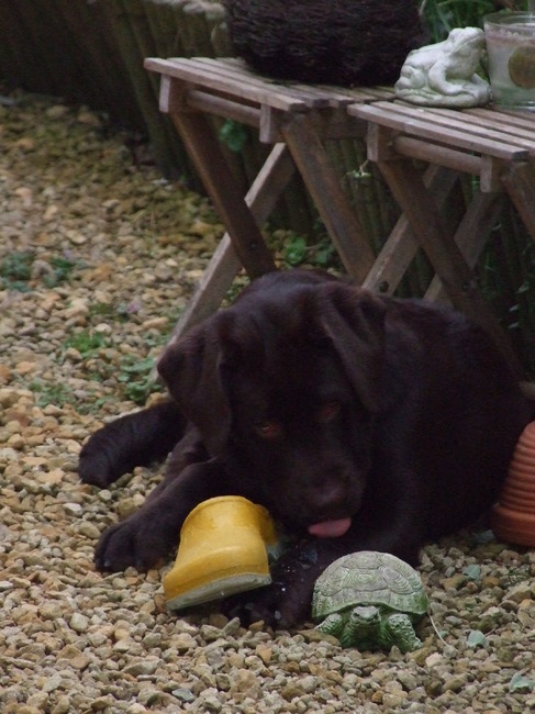 in de tuin met (kunstof)klomp van het vrouwtje(mag eigenlijk niet....) van Sheila, vrouwtje van Twinkle v.d.Ansjoros
