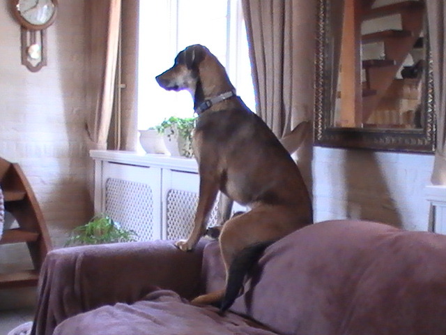 Honden foto's > Glenna en Fizzy > Wat zit ze daar nou te doen op die bankleuning?:O