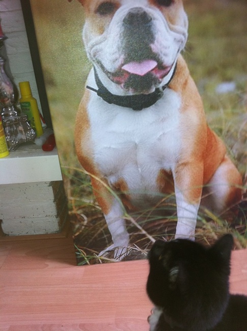 Honden foto's > luna en baasje michal > Luna op canvas en de poes vind het maar niks