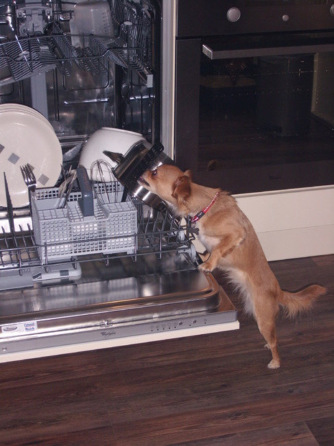 Honden foto's > Joy & Luna > Zware taak dat afwassen