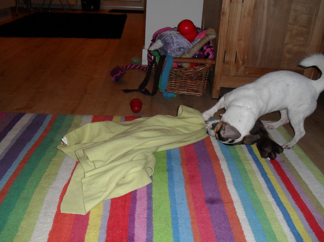 Honden foto's > Jin & Melo de tennisballenverzamelaar. > Een balletje in m'n kleedje.