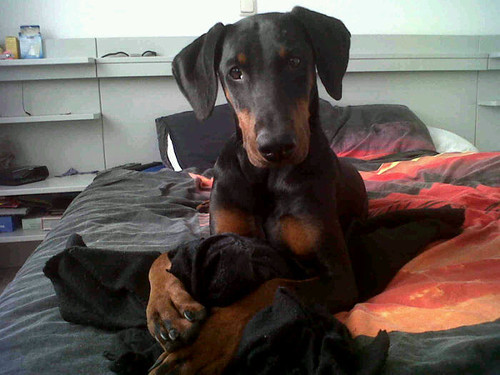 Hier ligt onze kleine Raven op bed. Ze weet dat ze dit niet mag en ik had haar betrapt haha hoe onschuldig kan een hond kijken... van Amanda van Gestel