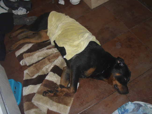 Honden foto's > Sanne & Rottweiler Bo > Dit doet ze na elke douche beurt haha!