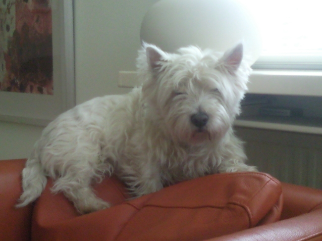 Honden foto's > Che > Zijn lieveling plaatsje, op de stoel voor het raam.