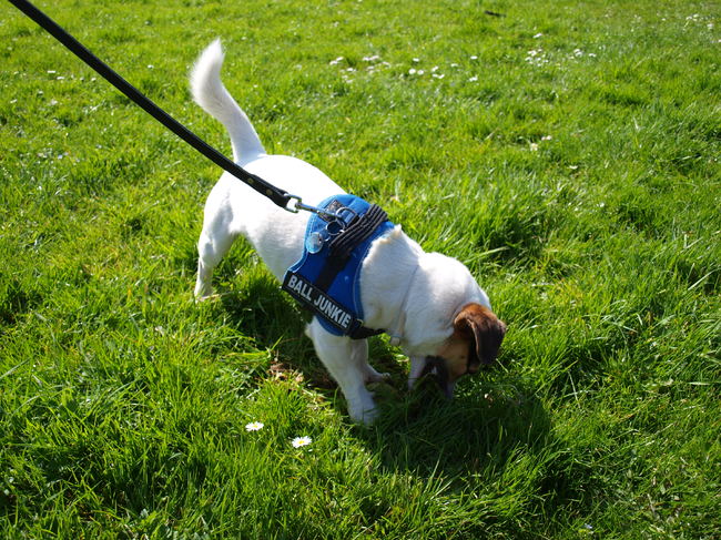 Honden foto's > Jin & Melo de tennisballenverzamelaar. > Gras eten.
