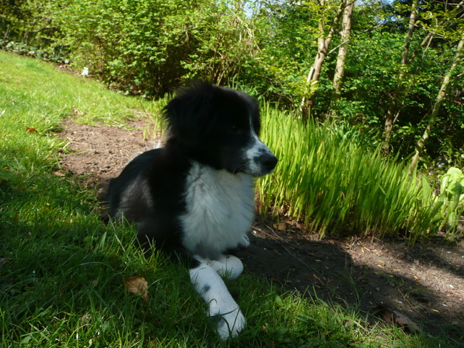 Honden foto's > silke & woody > woody zit heel graag in de tuin