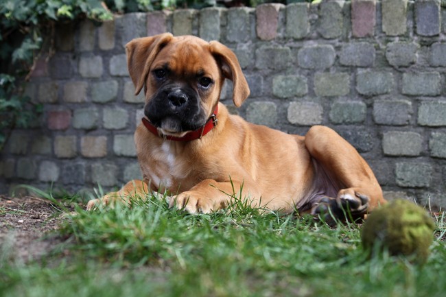 Honden foto's > Gertjan > Onze geweldige Boxer (15 weken) vindt het heerlijk in de tuin. Groet, Gertjan