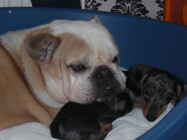 Echte vriendjes..het is zo leuk hoe mijn engelse bull met onze Julia omgaat,ze is zo klein maar hij is heel voorzichtig met haar!! van Tanja