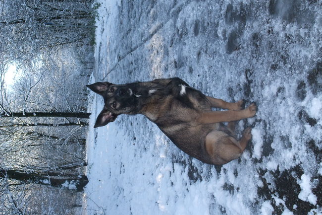 > Hier is Joy 16 weken. Voor het eerst in de sneeuw en dan ook nog keurig blijven zitten voor de foto
