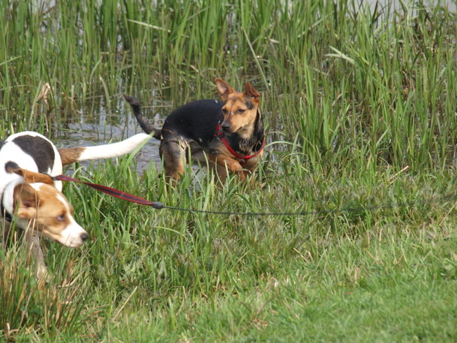 Honden foto's > Willi & Loekie > Spelen in het water, het was zo warm.