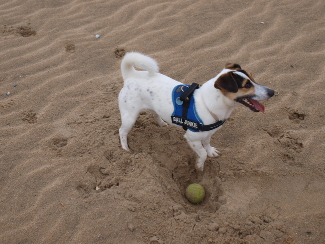 Honden foto's > Jin & Melo de tennisballenverzamelaar. > Kijk eens baas, wat een mooi gat?!