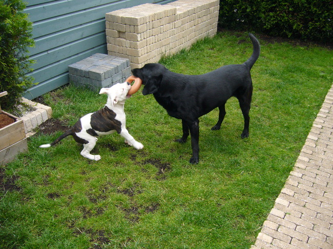 Honden foto's > Brenda *Tessa & Sky* > Samen met de donut spelen....