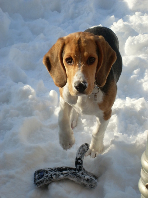 Honden foto's > Rowan > In de sneeuw met een handschoen ervandoor geweest