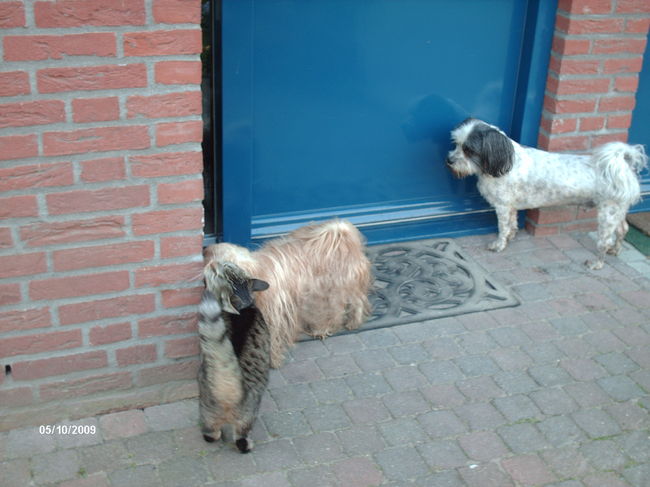 Honden foto's > liesbeth,Turbo,Luna, Levi en Faith > Ff knuffelen met tijgertje. En dan samen naar binnen.