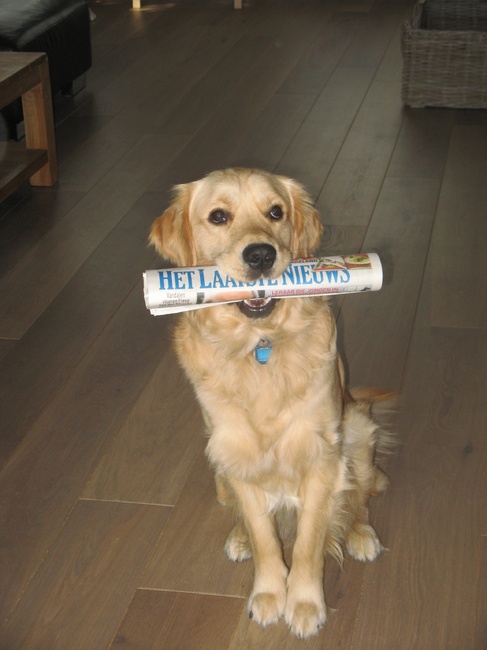 Sam met zijn favoriete krant van Jeske